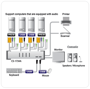 ATEN's CS1734 new 4-port KVM and Peripheral Sharing Switch brings extra value to conventional KVM switches by offering USB peripheral sharing capabilities, audio and microphone support, and multi-platform support for Mac, Sun, USB and PS/2. You can save money and space by eliminating the need for multiple monitors, keyboards, mice, and peripheral devices such as printers, scanners, zip drives, and more. Up to 127 different USB devices can be daisy chained from this KVMP switch. Sharing speakers and a microphone also offers extra value and convenience for the users. USB and KVM technology together makes cross-platform management easy. A single USB console can control PCs, Macs, or even Sun workstations, and share peripherals and audio devices between the computers. Any USB-enabled computers, using any USB-compatible operating system, can benefit from the efficiency, expense reduction and convenience of this switch.