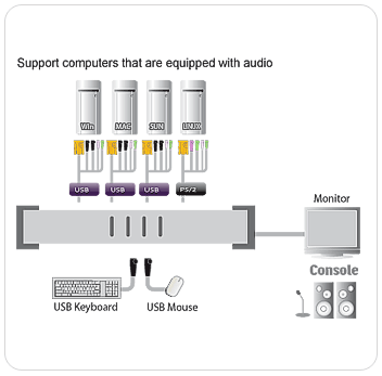 ATEN's CS1754 new 4-port MasterView Max is the ideal tool to help reduce redundant hardware. Four monitors, mice and keyboards are simply too expensive, bulky and inconvenient for most system administrators. Why bother when you can control all 4, or even up to 64 computers with a single keyboard, monitor and mouse. The added audio support allows you to enjoy music while working. Just think of the time, space and money you'll save, and added fun.