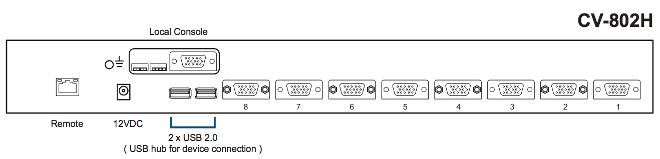 The CV-802H VGA DB-15 Hub KVM can be controlled by one user from up to 500ft (150m) away over CATx cable using the integrated CATx extender with the included KVM receiver.