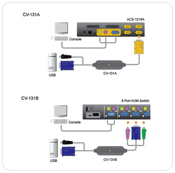 ATEN's CV131B is an interface converter that translates PS/2 keyboard, mouse and monitor signals to a USB SUN workstation's keyboard, mouse and monitor signals. The CV131B fully supports ATEN's existing MasterView KVM switches and console extender products. When used with a KVM switch, you may control IBM PS/2 PCs, Mac computers and Sun Stations from one keyboard, mouse and monitor. You may also use CV131B with ATEN's console extender which will allow you to control your Sun workstation from a remote keyboard, mouse and monitor.