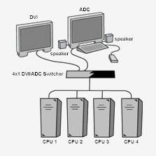 Simply plug your display, keyboard/mouse and audio peripherals directly into the 4x1 DVI/ADC Switcher's outputs and connect the supplied cables to the four computers you want to control. You then select the computer you want to work on using remote that comes with the unit.