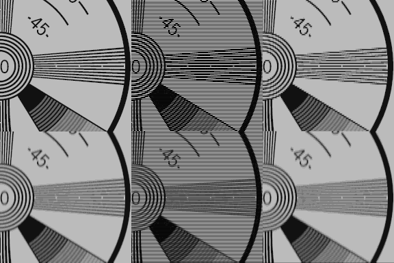 The Interline Twitter example above shows Progressive Frames on the left, Interlaced Frames in the center and Frames using line doublers on the right. The top images are of original resolution and the bottom images use a corrective anti-aliasing filter. While anti-aliasing mitigates issues with the flickering, the image clarity is sacraficed.