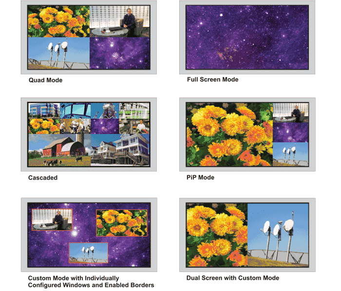 - Quad, Picture-in-Picture (PiP), Full Screen, and Custom display modes.