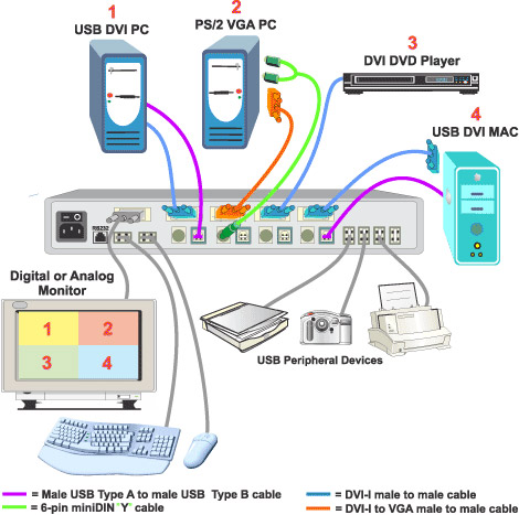 | Hosts | Four female DVI-I connectors. Four female USB Type B connectors. Four female 6-pin miniDIN connectors. Supports USB and PS/2 computers. Boots PCs SUNs and MACs simultaneously. Multiplatform support: Windows 2000/XP/Vista/7, Windows Server 2000/2003/2008, Solaris, Linux, FreeBSD, and MAC OS 9/10. Supports digital DVI devices, such as DVD players, satellite receivers and HDTV tuners. |