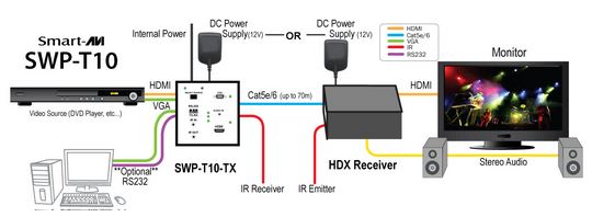 The T10's automatic scaler and converter bumps picture resolution up to 1080p (1920 x 1080 @ 60Hz), and seamless automatic input recognition optimizes signals. Conveniently powered by either the transmitting or receiving unit, the SWP-T10 blends SmartAVI's signature ease-of-use with quality, highly-adaptable configurations right for any set-up.