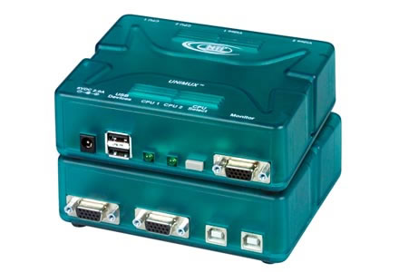 The NTI UNIMUX 2 Port USB switch (UNIMUX-USBV-2) allows one user to access two USB CPUs with only one USB keyboard, USB mouse, and VGA Monitor. Internal microprocessors allow both CPUs to boot simultaneously and error-free. Port selection is accomplished by a front panel push button or commands typed on the keyboard. The UNIMUX-USBV-2 switch is compatible with USB CPU ports only. Great for Small Office/Home Office (SOHO) use.